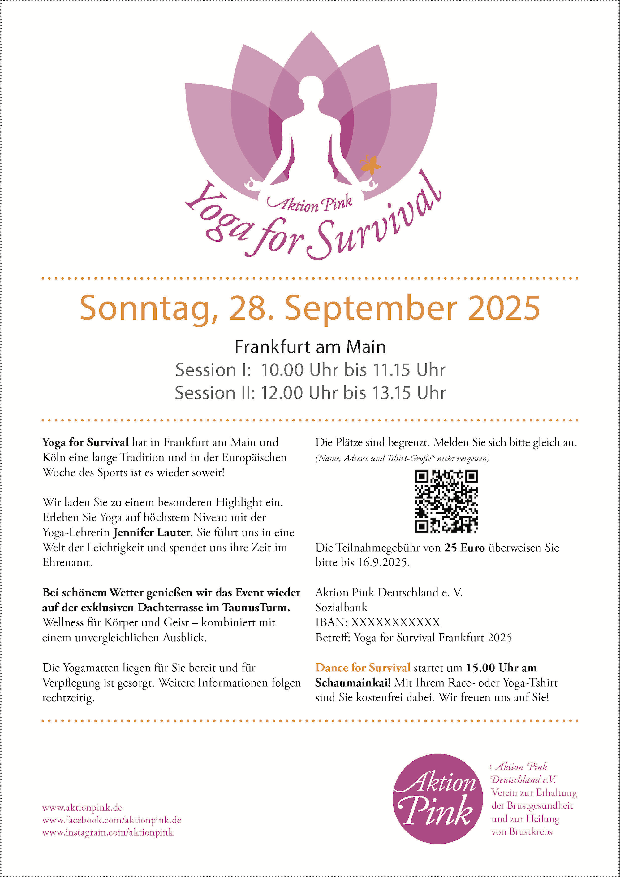 Ich bin damit einverstanden, dass meine angegebenen personenbezogenen Daten zur Durchführung des Aktion Pink Deutschland e.V.-Yoga for Survival und zur Information von zukünftigen Veranstaltungen von Aktion Pink Deutschland e.V. erhoben, dauerhaft elektronisch gespeichert und verarbeitet, aber nicht weitergegeben werden. Diese Einwilligung kann ich jederzeit mit Wirkung für die Zukunft widerrufen.